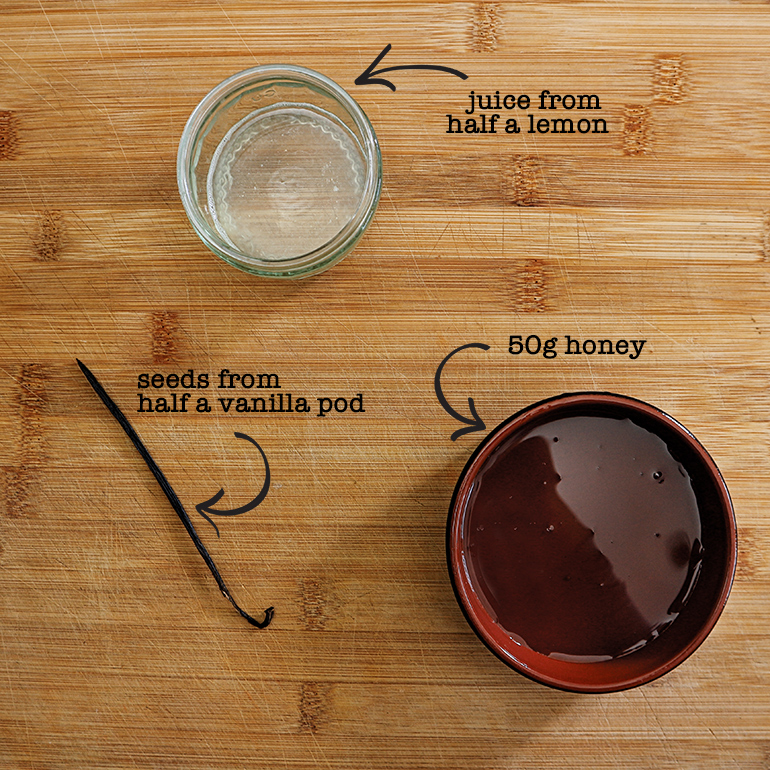1. Place honey, lemon juice and seeds from half a vanilla pod into a small pan and gently warm up until everything is just combined.