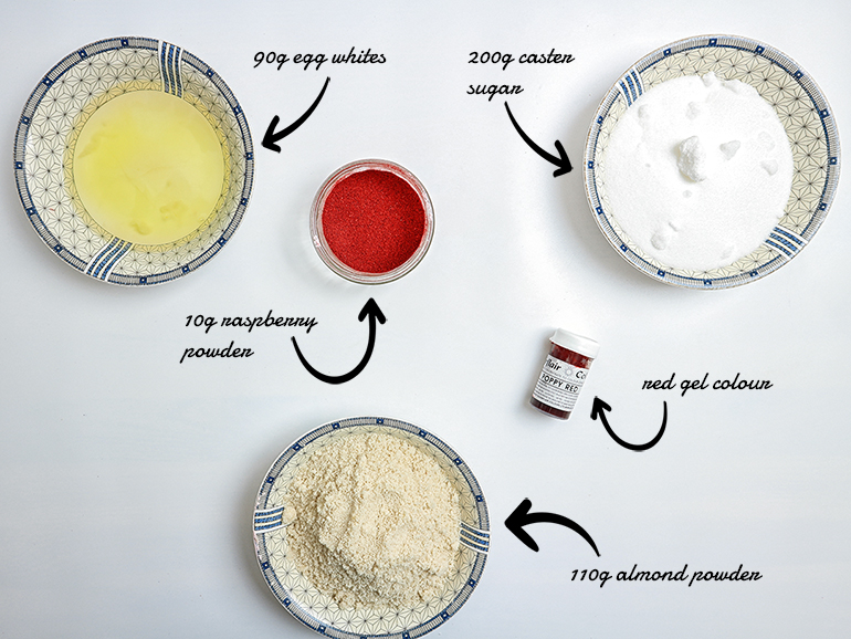 - Red gel colour: Red colour is optional for this recipe but it will give the macarons an even pinker colour.